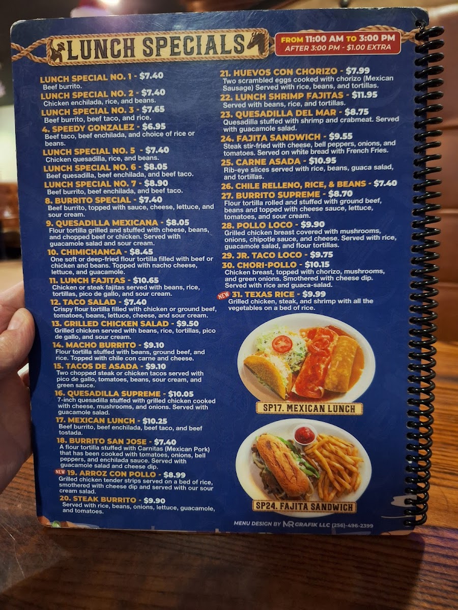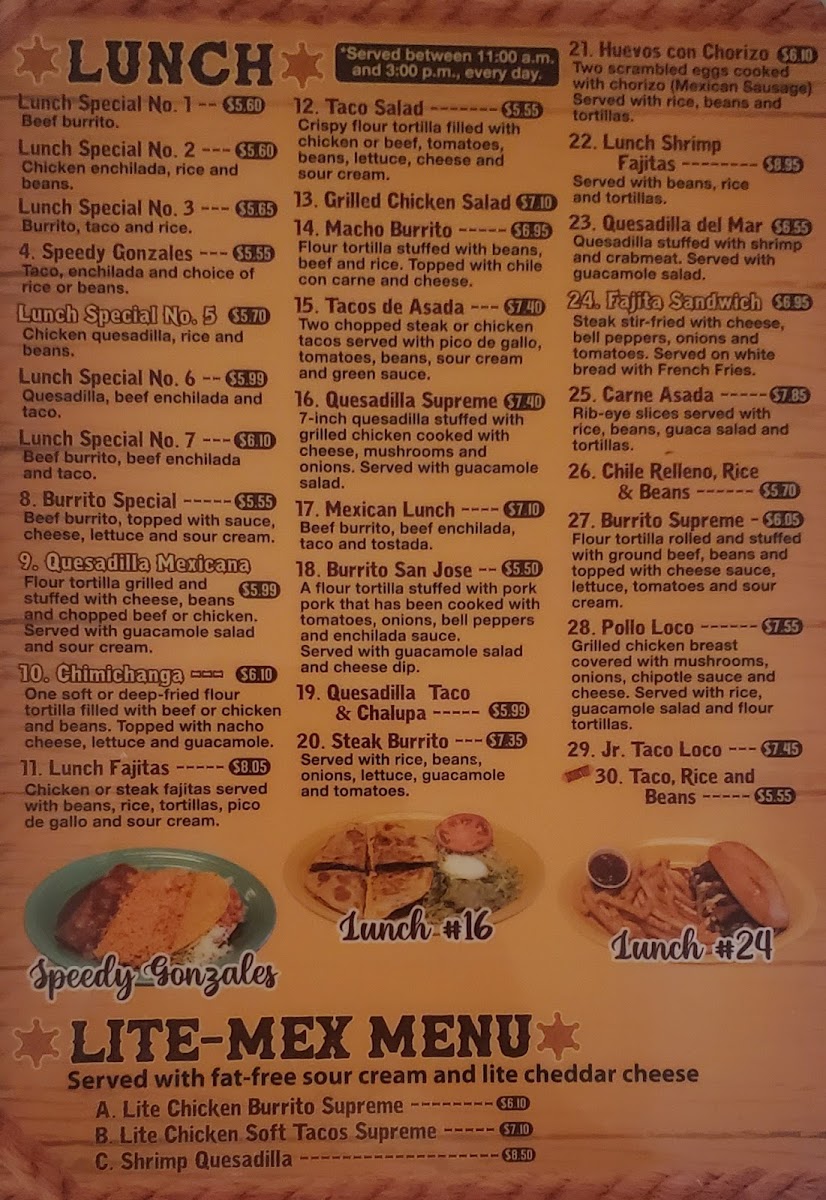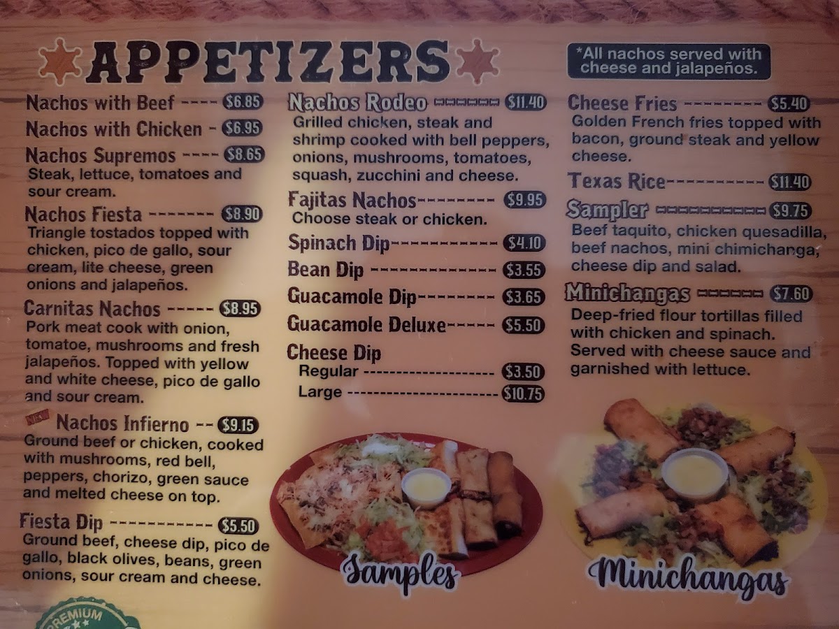 You’ll find a variety of dishes ranging from classic appetizers like chips and salsa or cheese dip, to hearty mains such as the fajitas rodeo, shrimp quesadilla, and seafood chimichanga. Vegetarian options like bean burritos and spinach enchiladas provide thoughtful choices for varied tastes, while sides such as Mexican rice, refried beans, and fresh tortillas help round out each meal.